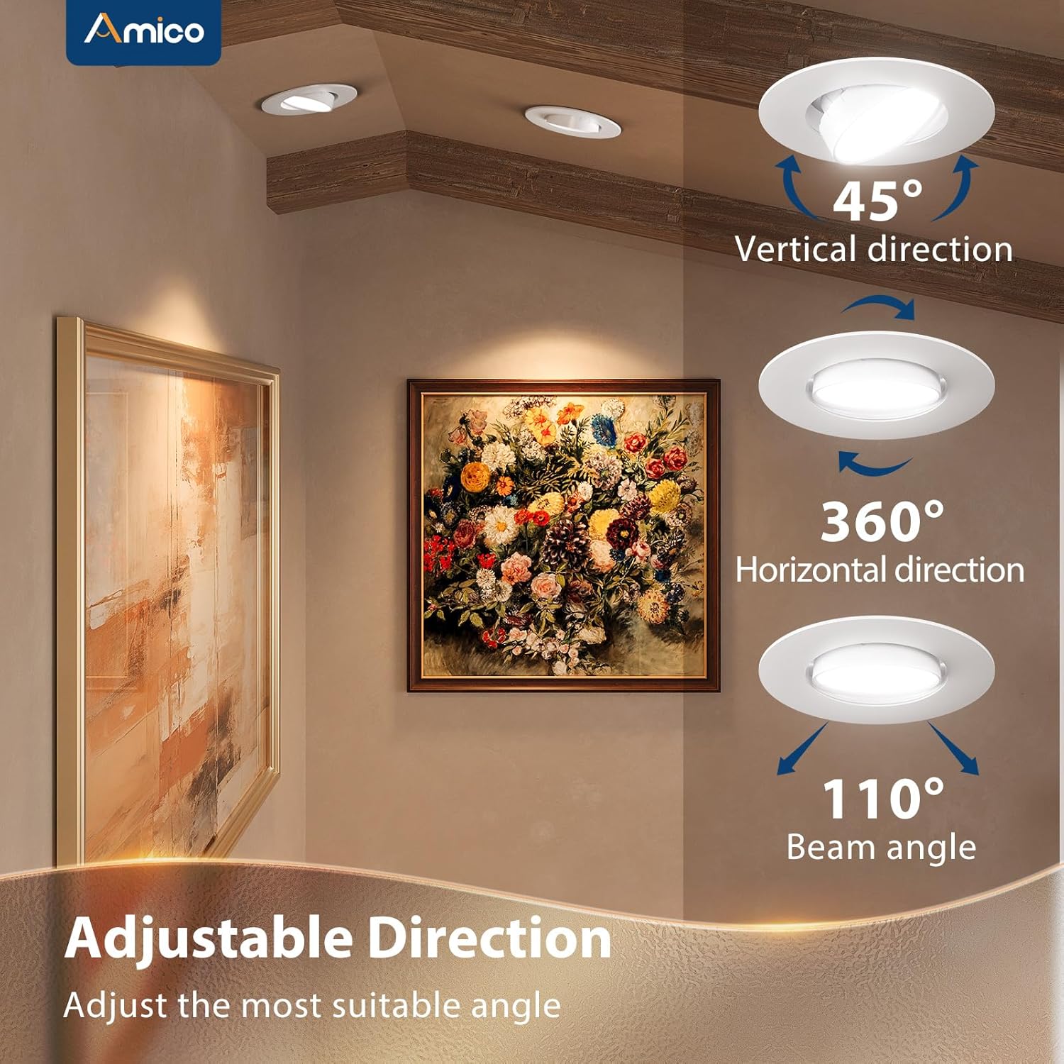 • [Adjustable Angles] With a swiveling lens, this LED Gimbal Downlight offers the ability to focus light on artwork, walls, sculptures, and accent pieces in your home or office. Tilt the optic 45° and swivel a full 360°.