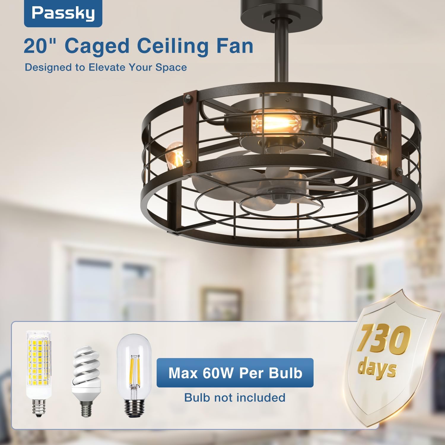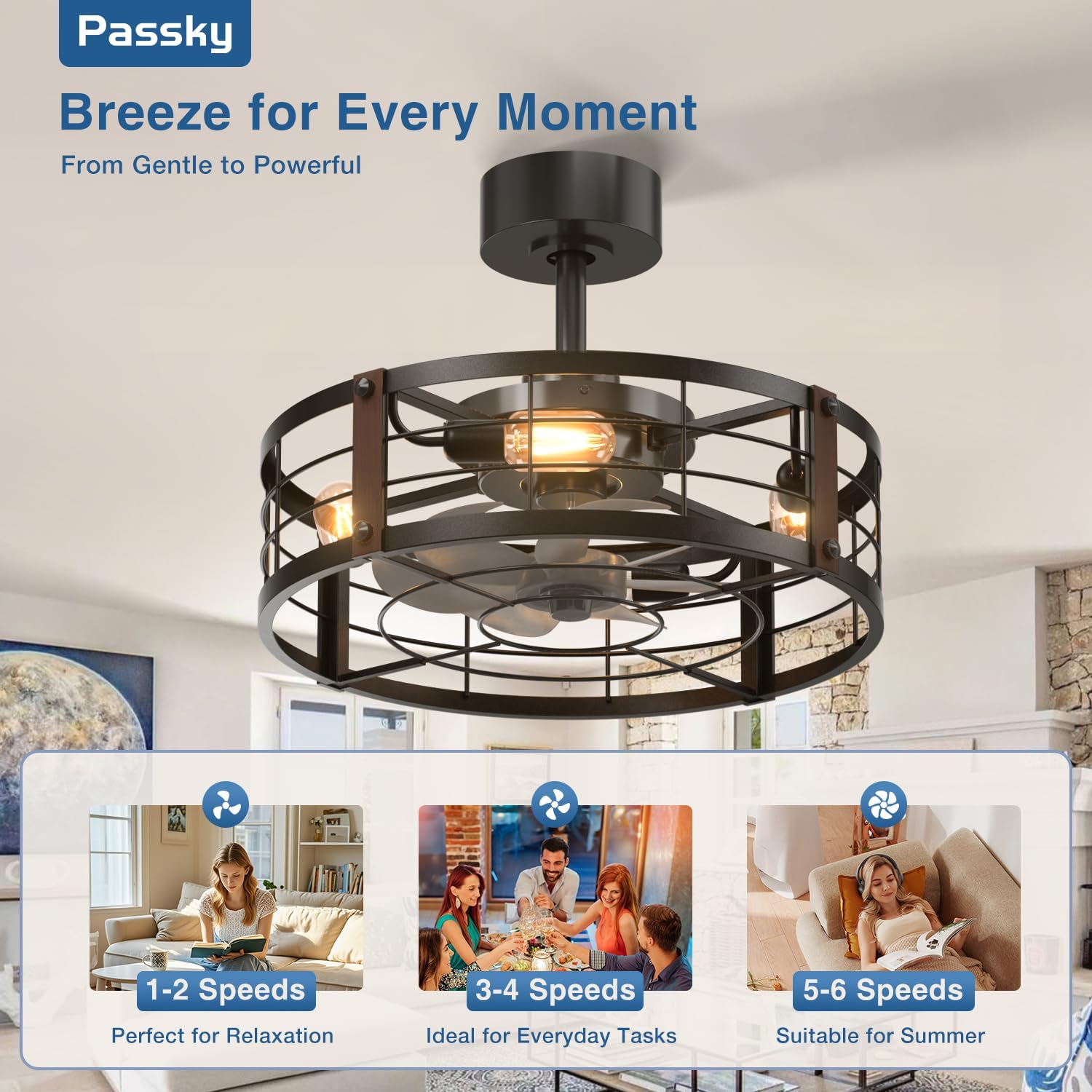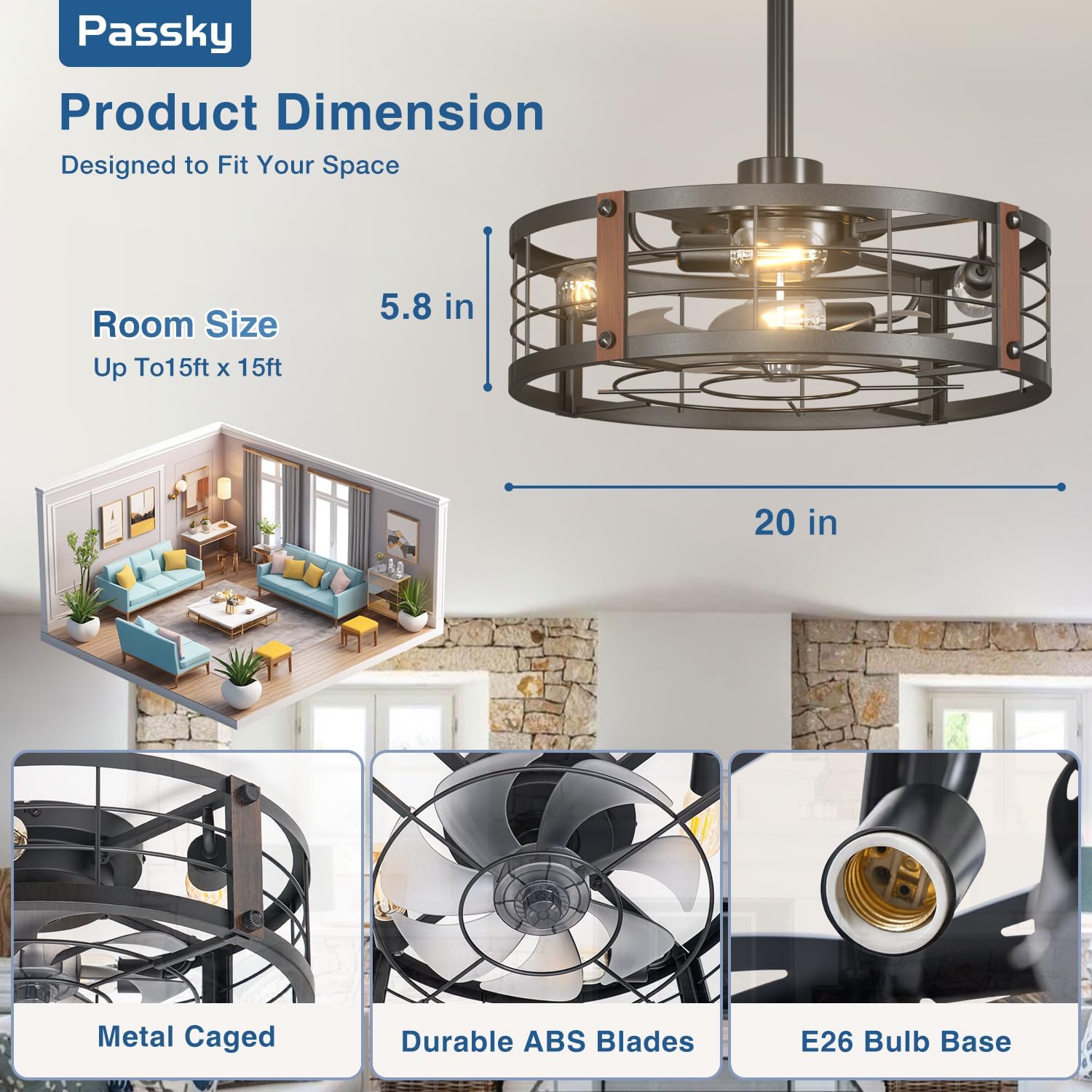 - Caged Ceiling Fan with Lights: This 20" farmhouse downrod mount ceiling fan combines lighting and cooling in one elegant design. The industrial black metal cage adds a decorative touch, perfect for bedrooms, kitchens, living rooms, or small spaces.