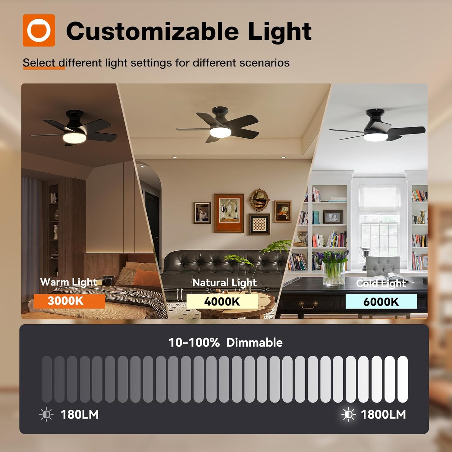 - Customizable Light: Depending on your need for the space, the light output you need can vary. If you’re having a cozy night in, you may need less light, while activities like family game night or homework time may need more. Our smart ceiling fans with lights are dimmable (10%-100%) for allowing you to find the ideal light for every occasion. At the same time, you can also select from 3 color temperature: 3000K-warm white, 4000K-nature white, 6000K- cold white.