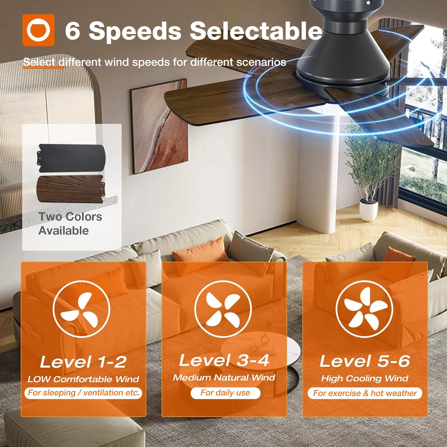 - Reversible DC Motor: The high-quality & high-speed motor brings a perfect wind experience. The wind speed can be adjusted in 6 gears, you can choose between comfortable wind, natural wind and strong wind. Reversible dual-direction fan improves air circulation to keep you warm in winter and cool in summer. Our fan blades are double sided in different colors, one side is black and the other side is dark wood grain. Choose the fan blade color that best fits your home decor!
