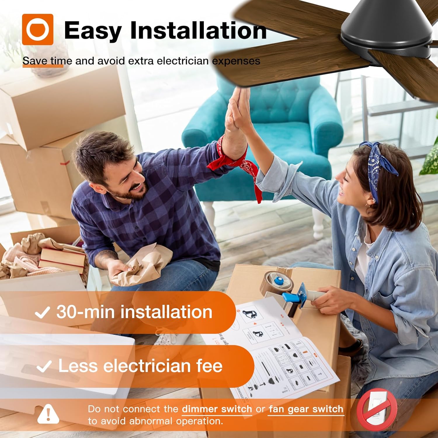 - Fan&Light Memory Function: First choose the light brightness and color temperature you want, and set the fan speed. Then turn off the power by wall switch, turned on the power again, the light and the fan will maintain the previous settings. (Notice: Do not connect to dimmer switches or fan speed switches to prevent operational malfunctions.)