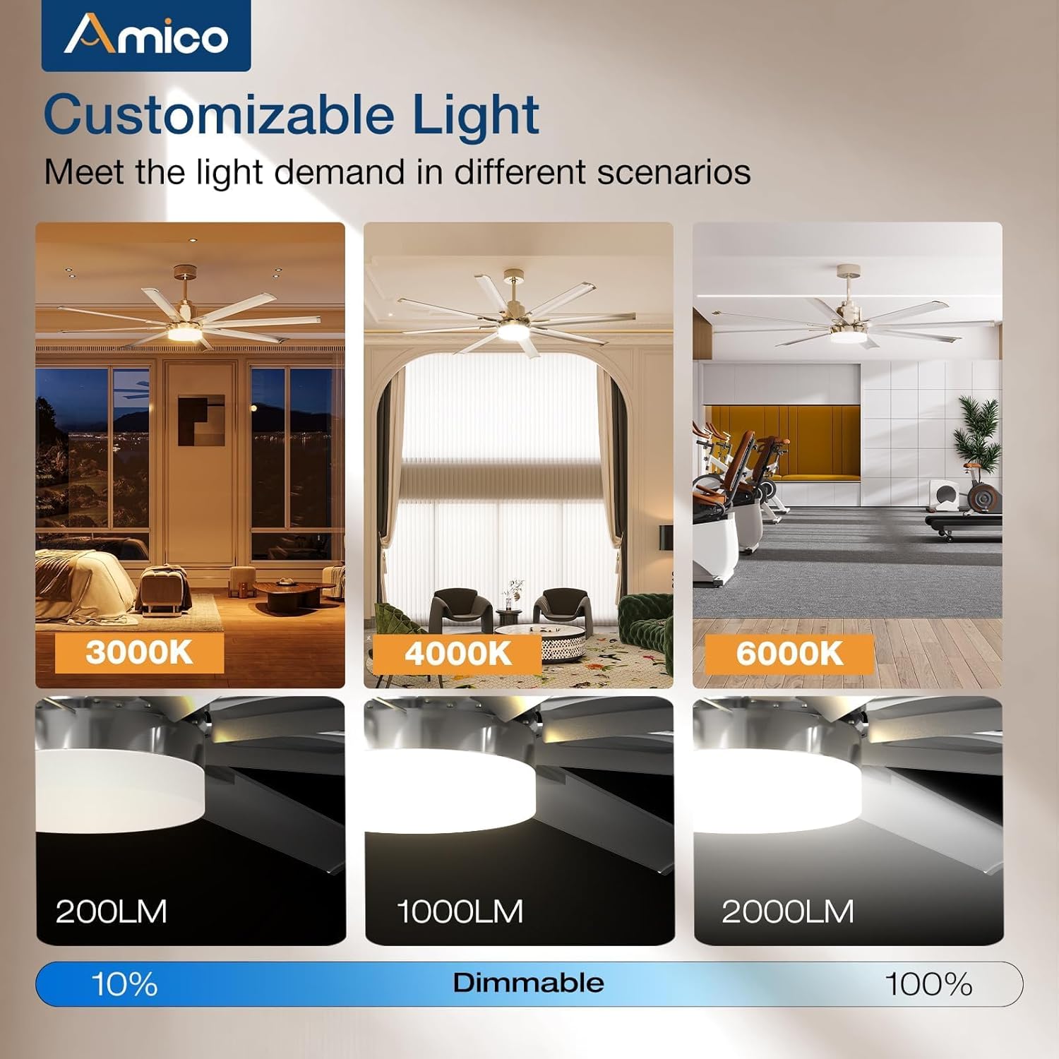 - Customizable Light: Depending on your need for the space, the light output you need can vary. Our ceiling fans with lights are dimmable (10%-100%) for allowing you to find the ideal light for every occasion. At the same time, you can also select from 3 color temperature: 3000K, 4000K, 6000K.