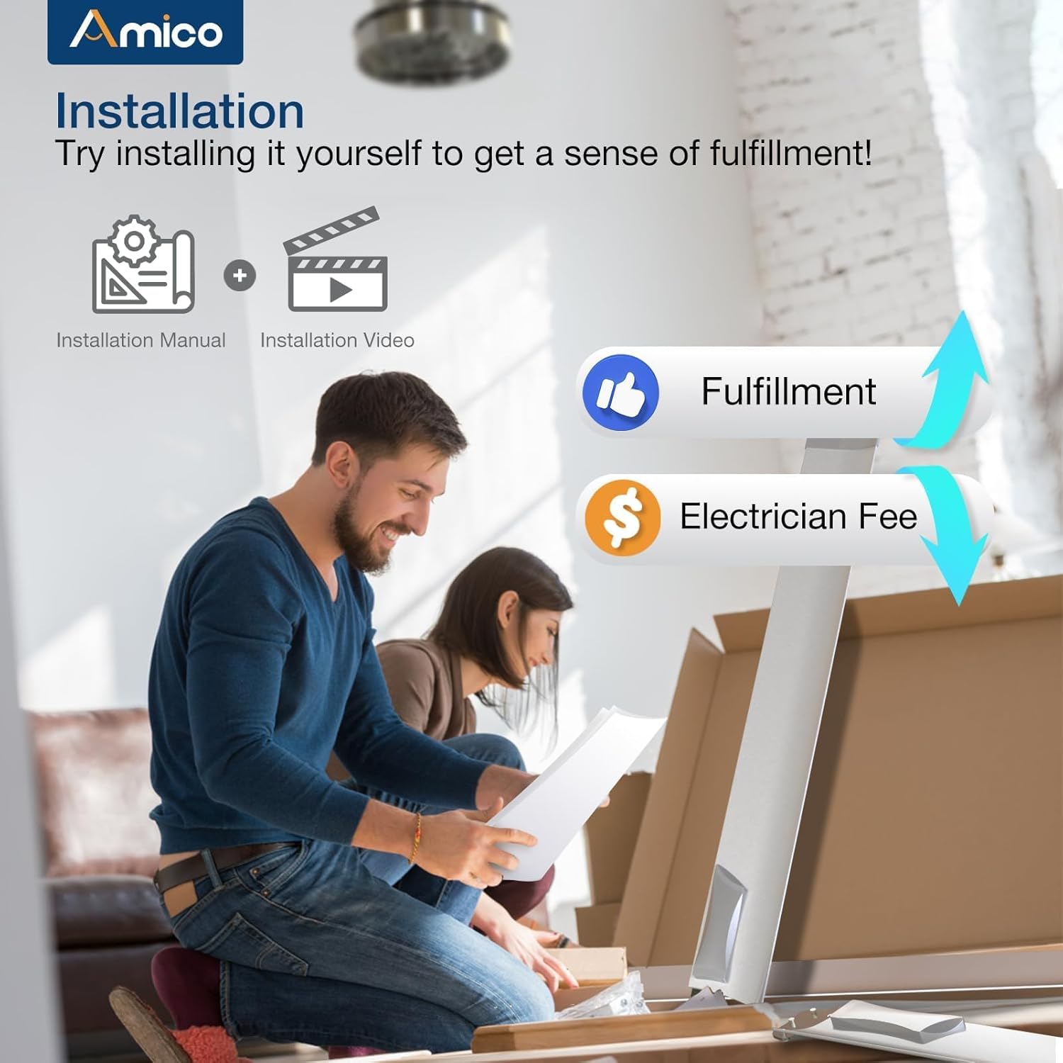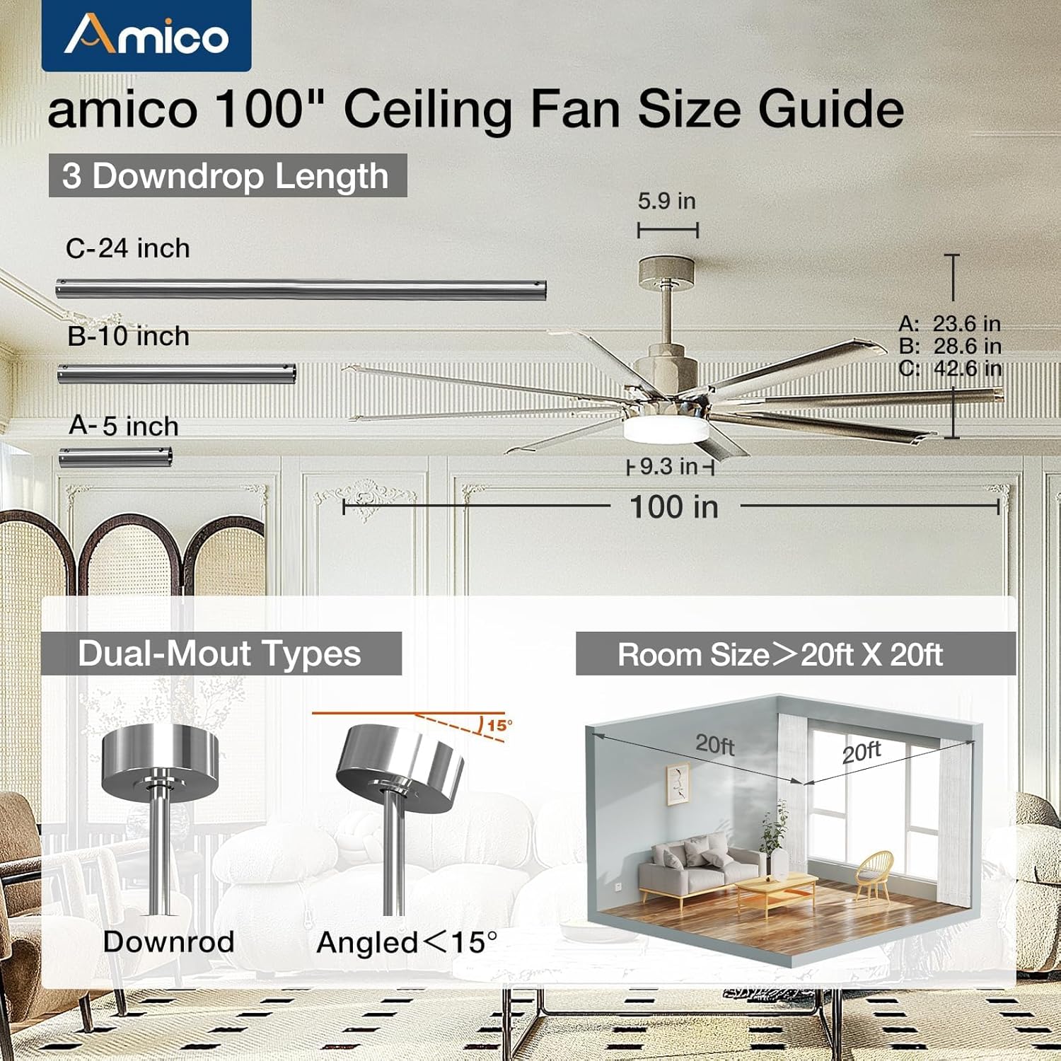 - 100% SATISFACTION: The amico ceiling fan is easy to install. We provides detailed instructions and installation video, ideal for DIYers. Package includes 3 downrods (5"/10"/24"), installation manual and wire. We provide 24 hours technical support and 24 months worry-free warranty service! Contact us freely if you have any problems during the use or installation! ( Large Size recommended for two-person installation )