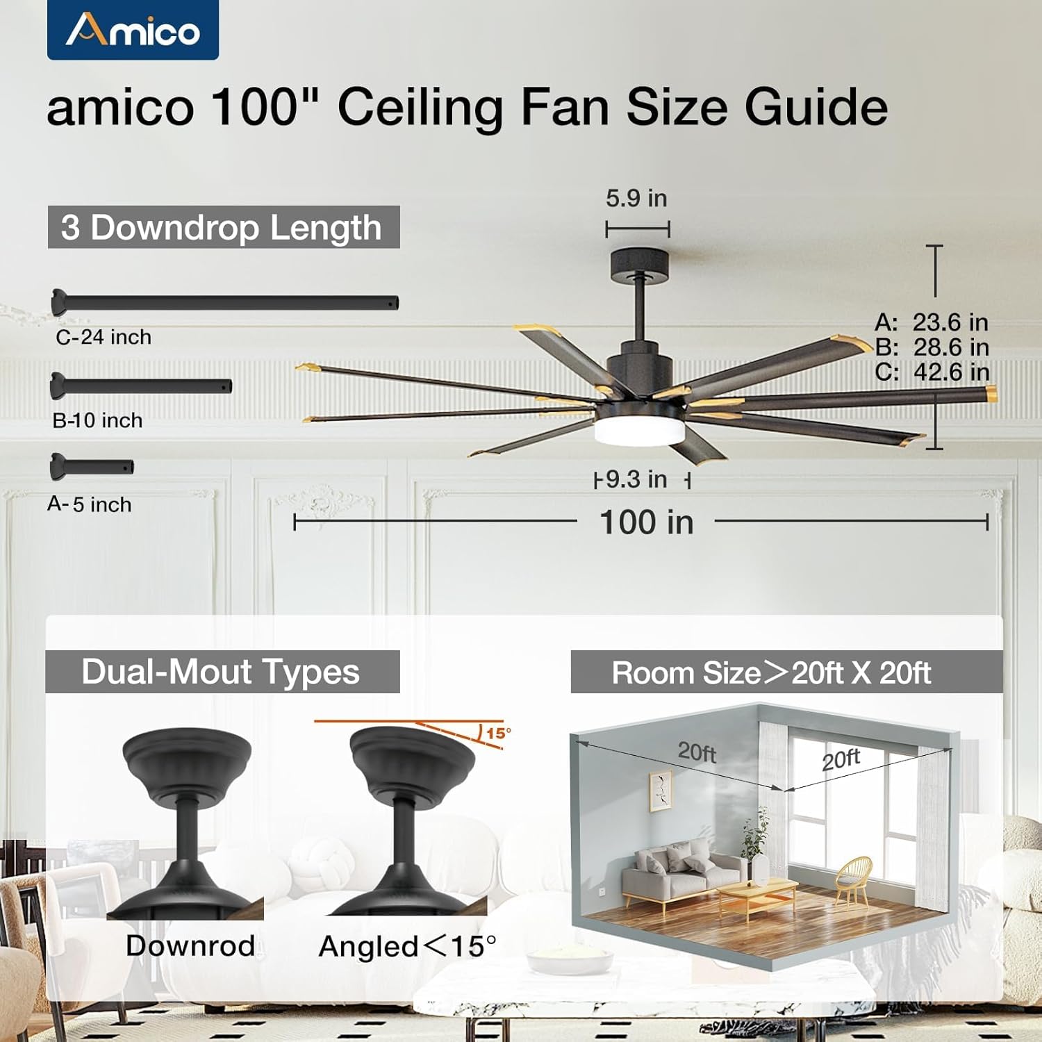 - 100% SATISFACTION: The amico ceiling fan is easy to install. We provides detailed instructions and installation video, ideal for DIYers. Package includes 3 downrods (5"/10"/24"), installation manual and wire. We provide 24 hours technical support and 24 months worry-free warranty service! Contact us freely if you have any problems during the use or installation! ( Large Size recommended for two-person installation )