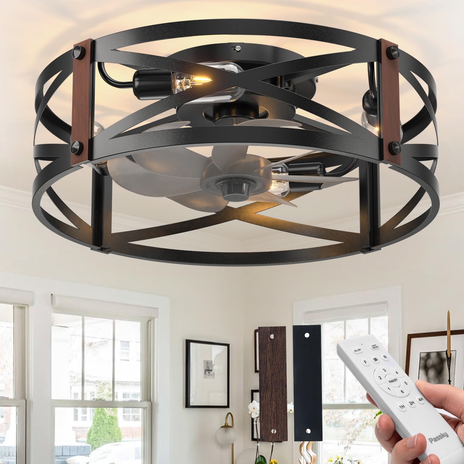 - 2-in-1 Caged Ceiling Fan with Lights: This 20" farmhouse flush mount ceiling fan combines lighting and cooling in one elegant design. The industrial black metal cage adds a decorative touch, perfect for bedrooms, kitchens, living rooms, or small spaces.