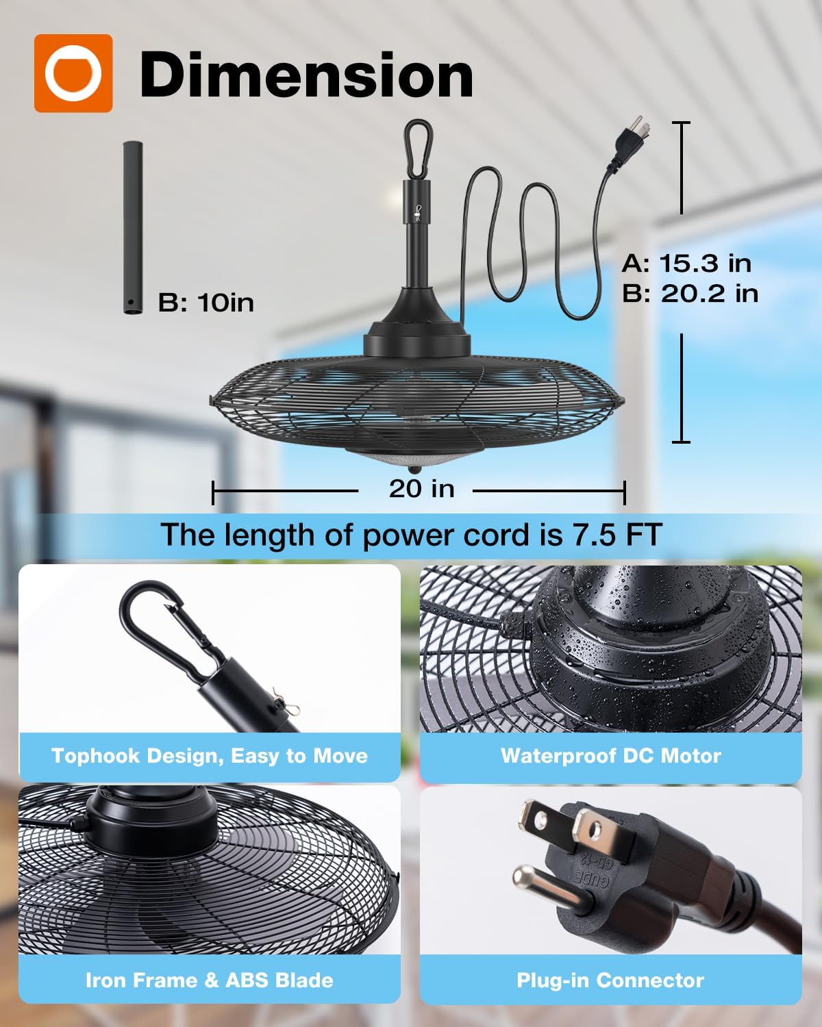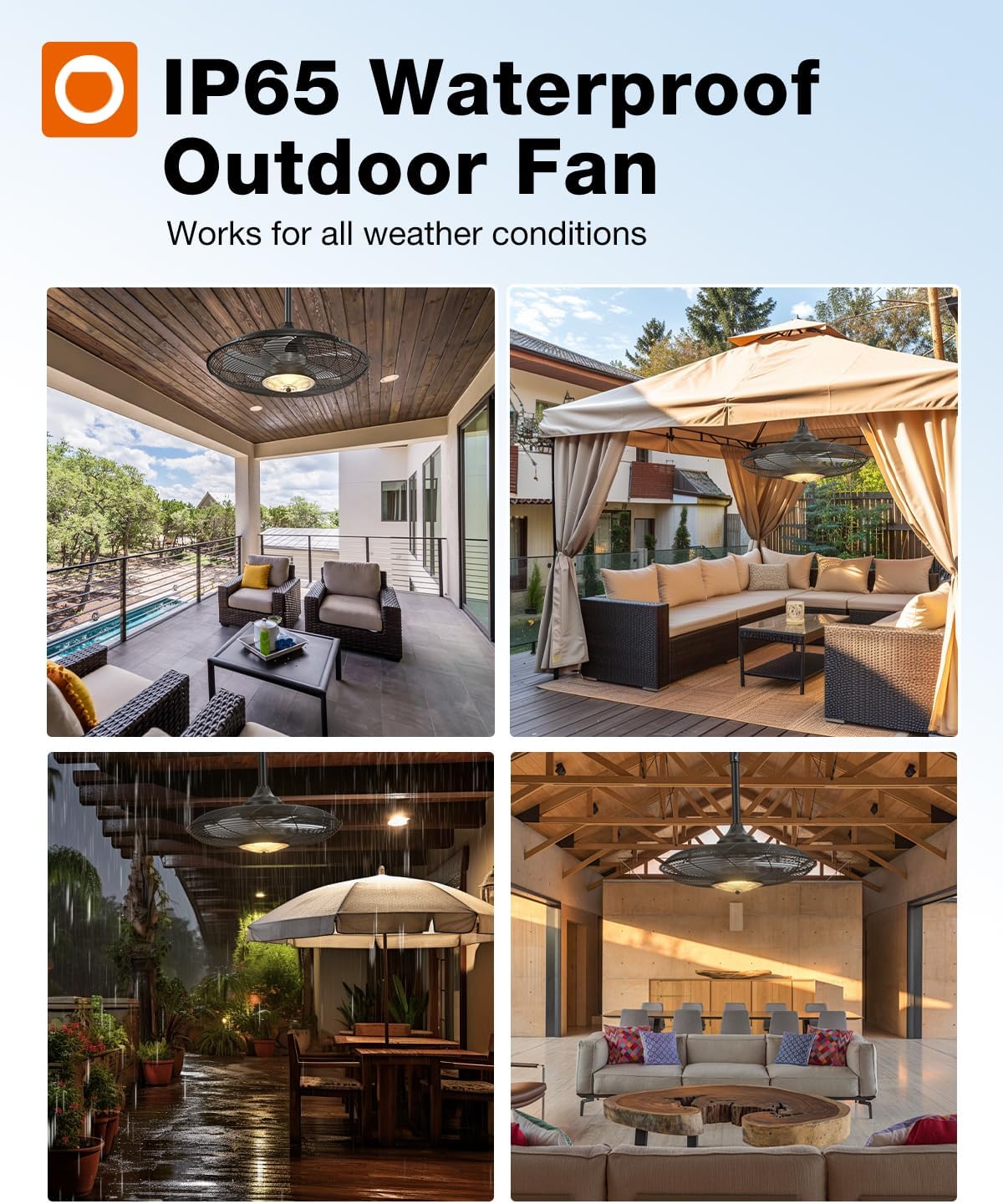 • IP65 Waterproof Outdoor Fan: The sealed motor and rust-resistant materials protect against water jets and outdoor elements, making it ideal for patios, gazebos, and open-air spaces. Its durable construction prevents moisture damage, extending lifespan and performance.Enjoy powerful cooling with confidence, no matter the weather!