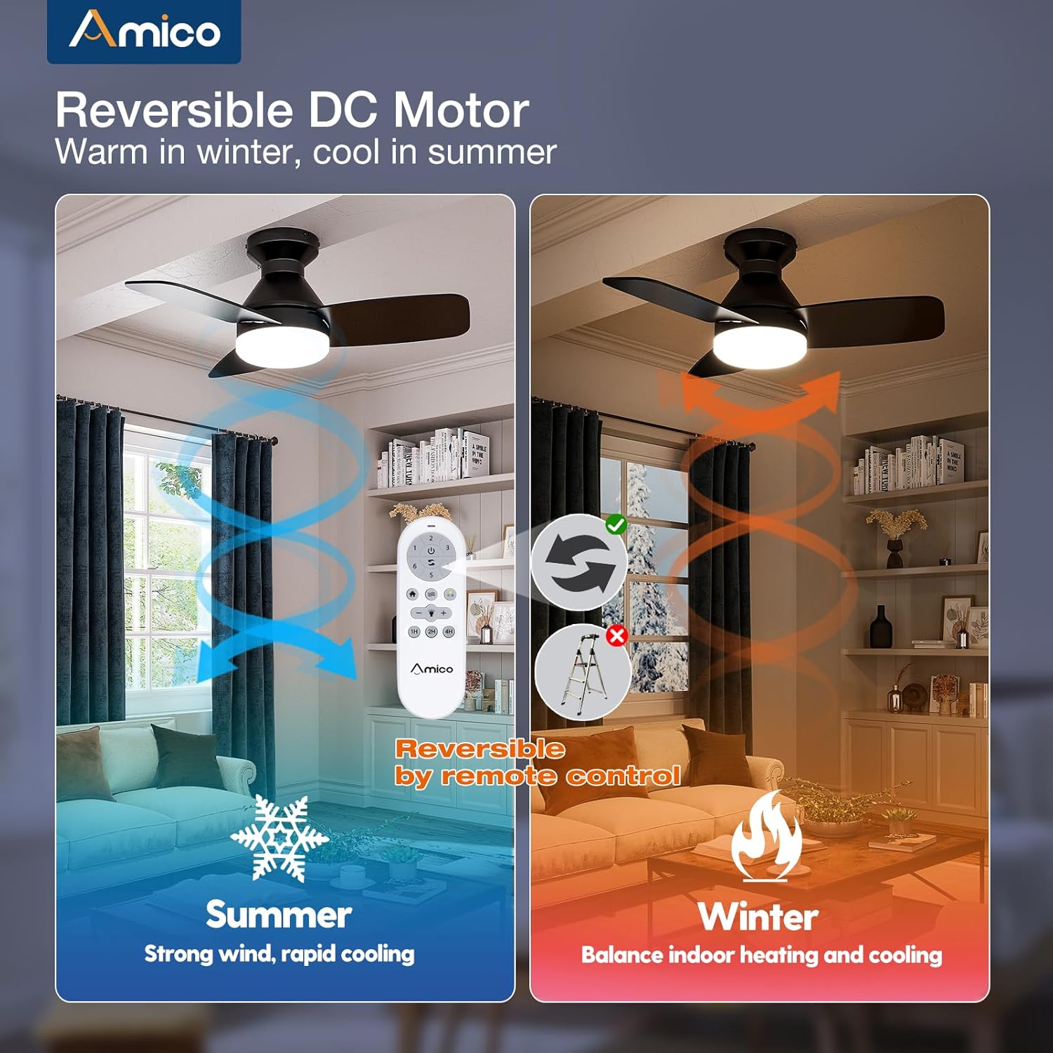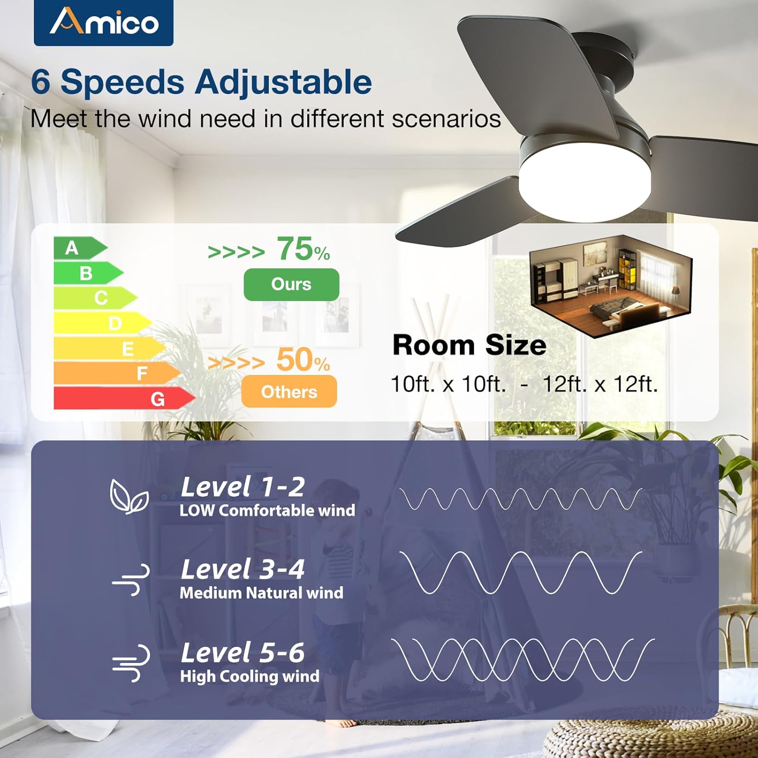 - Ceiling Fan with Light: Decorate your home with Amico ceiling fan! While bringing you coolness and comfort, it also becomes a beautiful decorative piece for your home. Our 30 inch small ceiling fan with light remote control has A energy efficiency rating, which can avoid 80% of electricity loss compared with traditional fans.