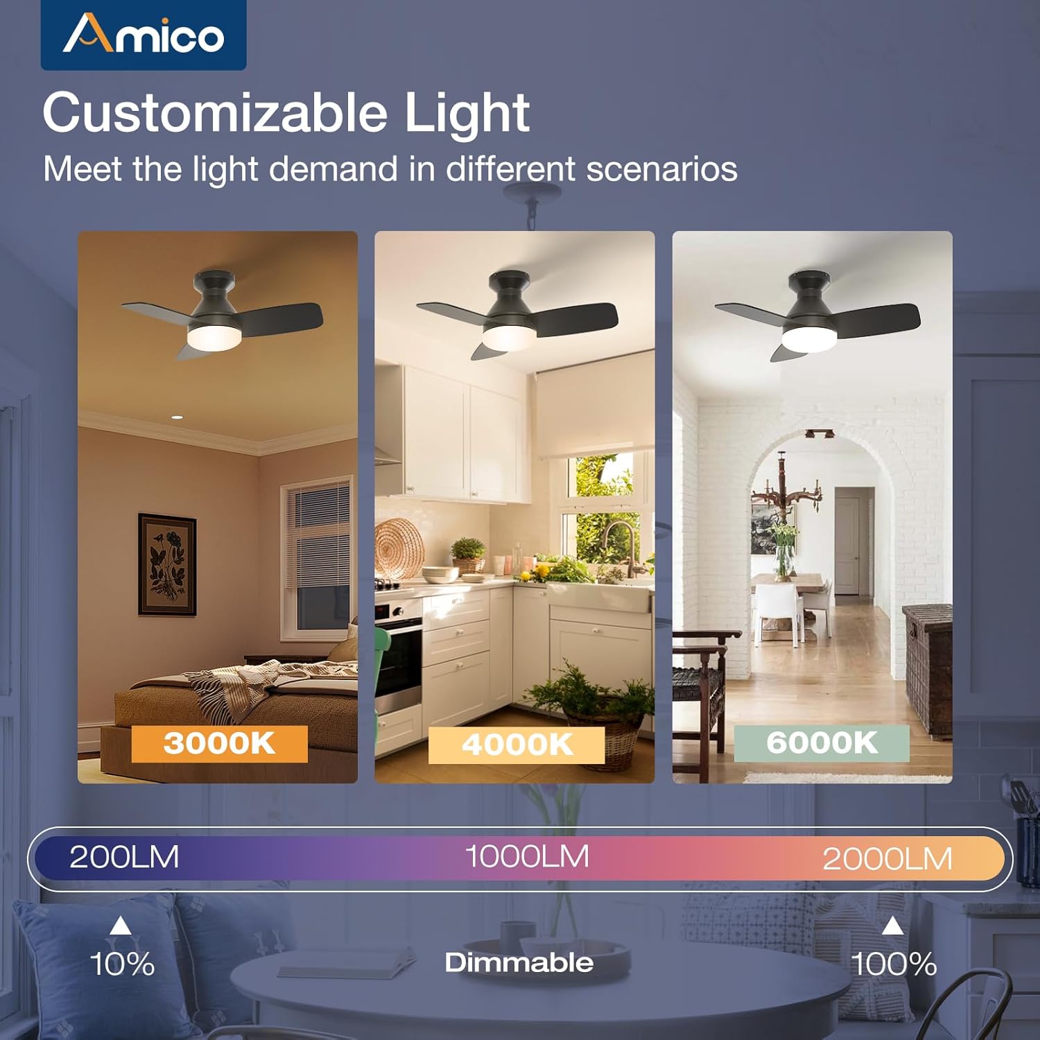 - Customizable Light: Depending on your need for the space, the light output you need can vary. If you’re having a cozy night in, you may need less light, while activities like family game night or homework time may need more. Our ceiling fans with lights are dimmable (10%-100%) for allowing you to find the ideal light for every occasion. At the same time, you can also select from 3 color temperature: 3000K, 4000K, 6000K.