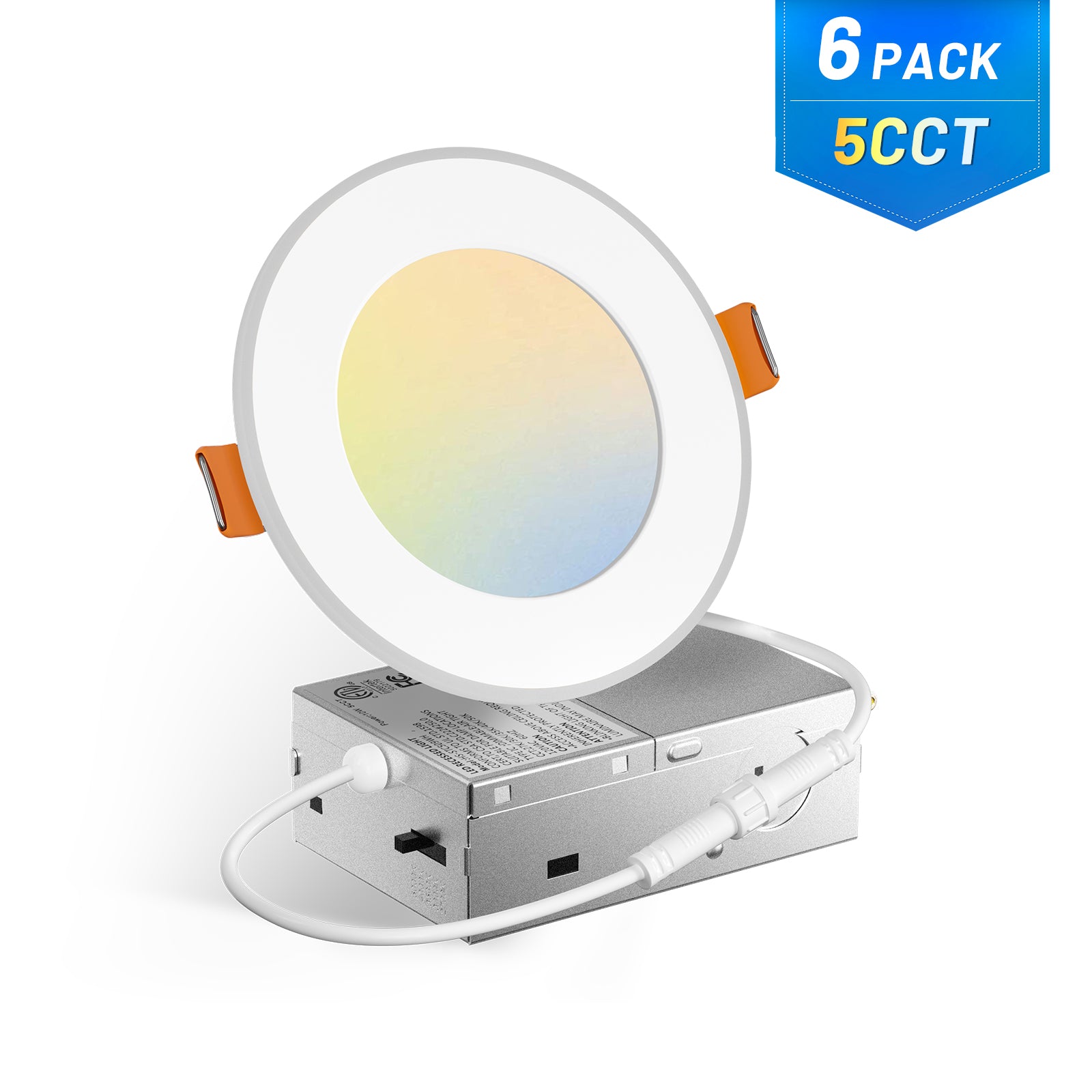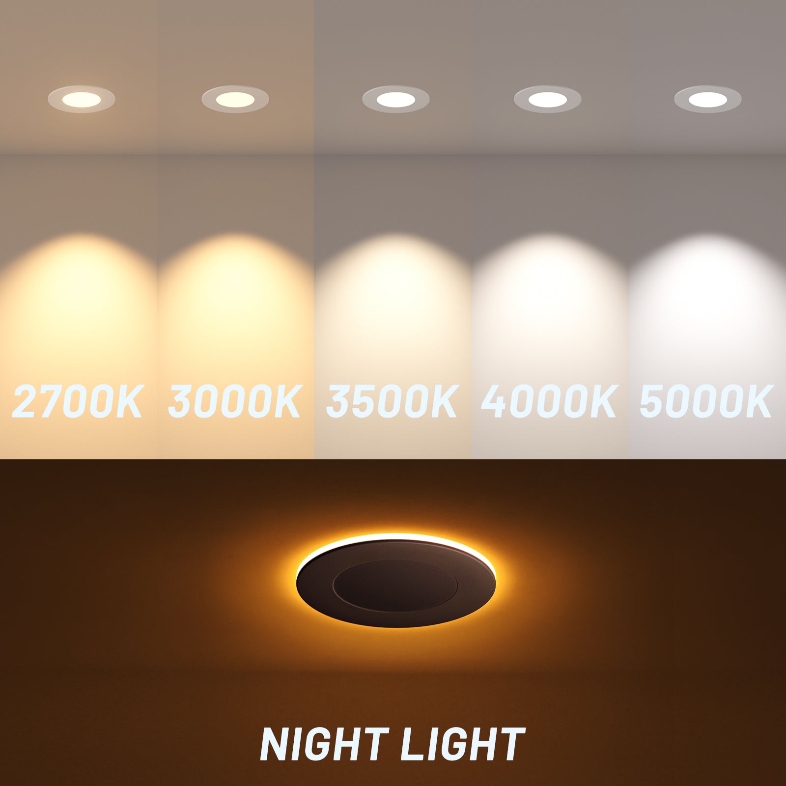 - 5CCT Recessed Lights With Night Light: Our recessed lighting 4 inch with night light in downlight mode offers you the option of 2700K, 3000K, 3500K, 4000K, 5000K, 5 color temperature you can choose before install into ceiling, no need to worry about what color temperature to buy, eliminates the hassle of returning or exchange products due to inappropriate color temperature.