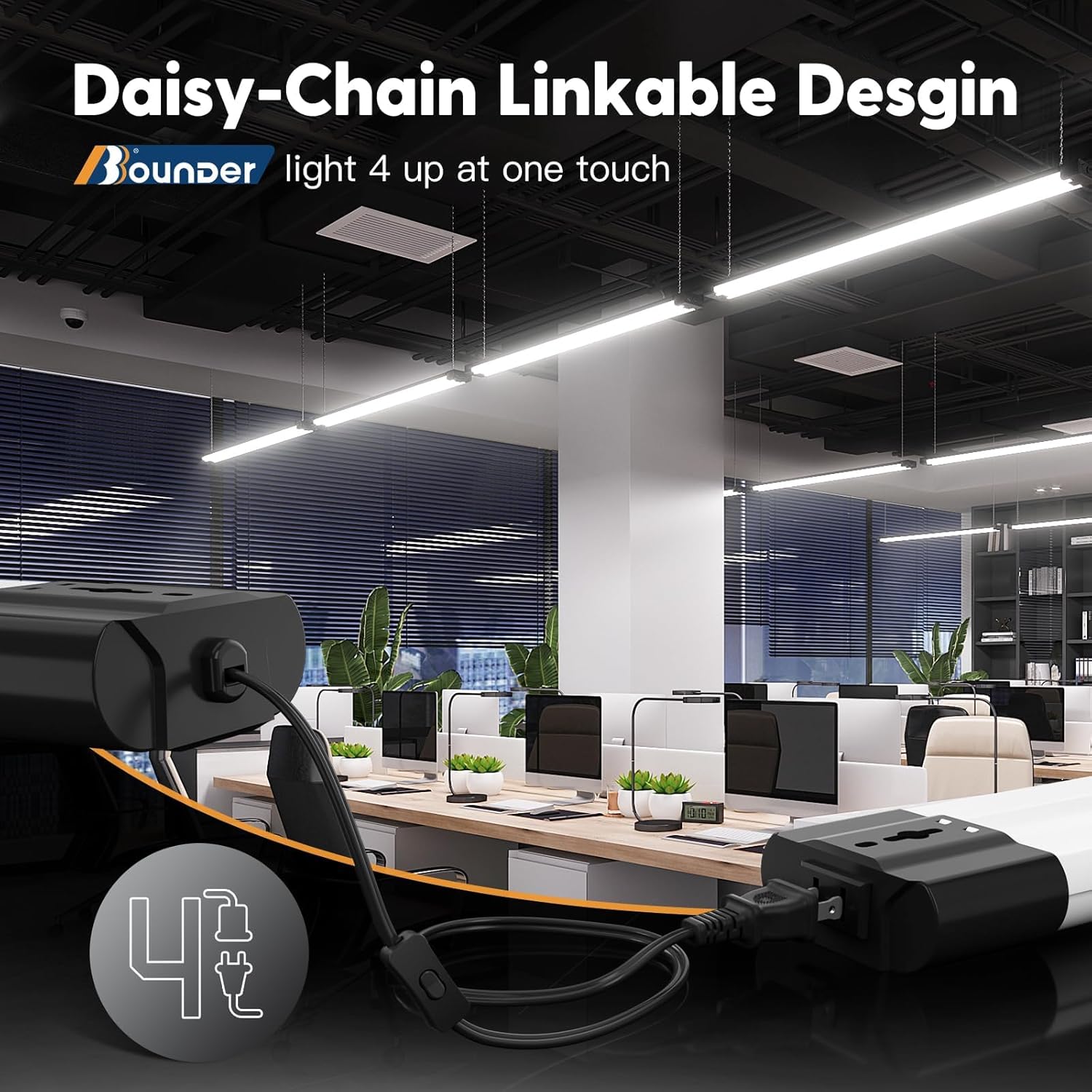 - Daisy-Chain Linkability: Our 4-foot LED shop lights are fully linkable, and can seamlessly connect up to 4 lights with plug connections for energy savings in your home, office, or any workspace