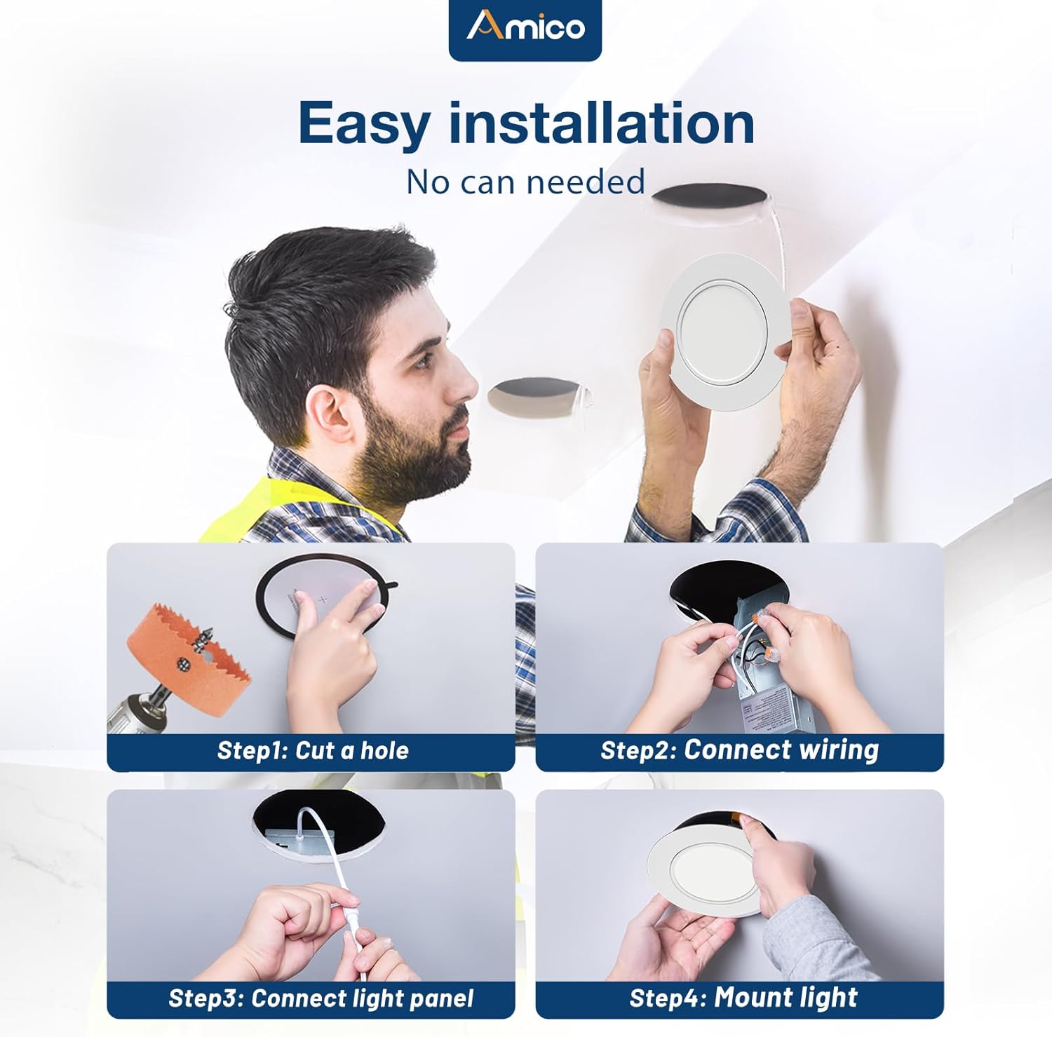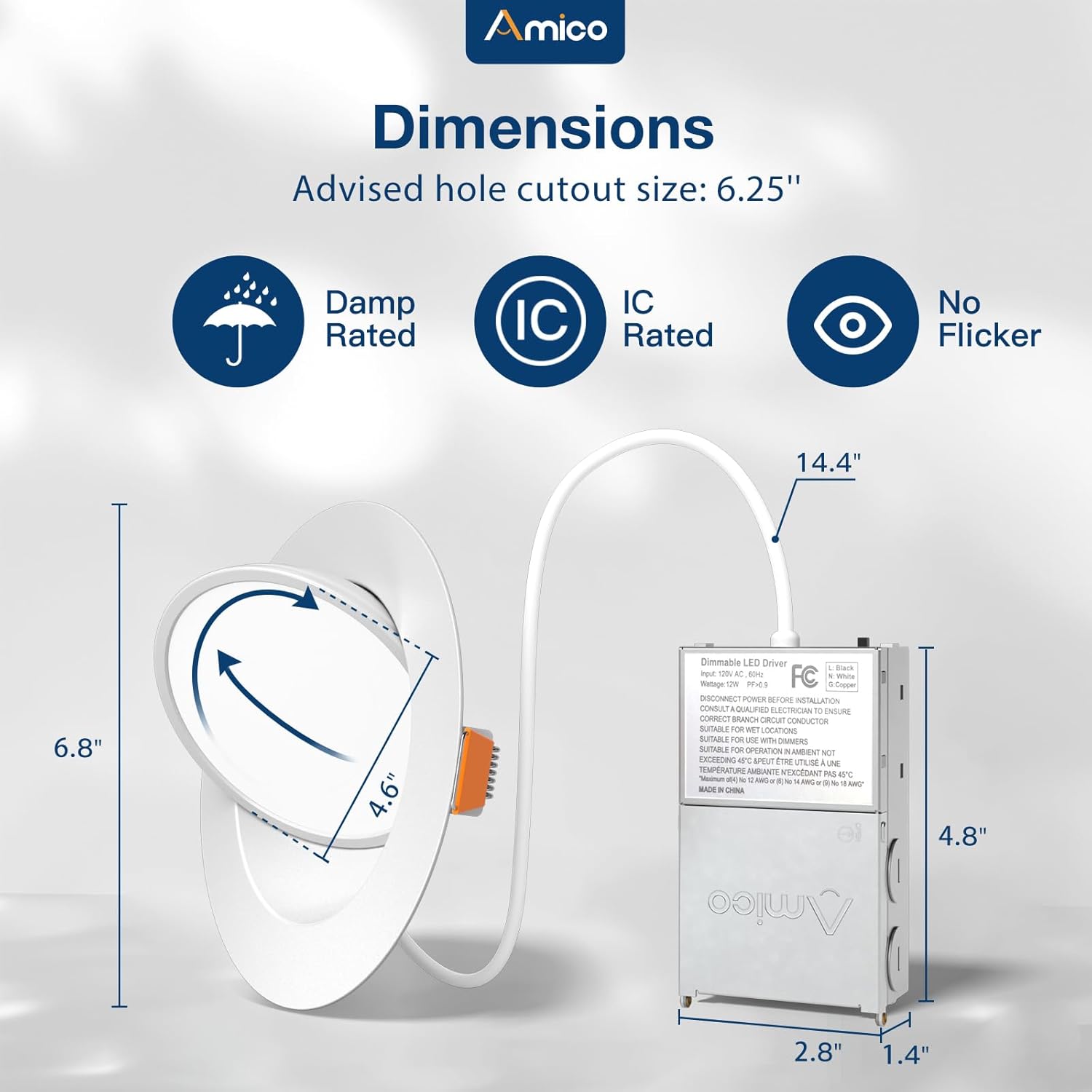 • IC Rated: Amico's canless LED recessed light is IC rated, which is permitted to be in contact with insulations in ceilings, meaning the junction box is thermally protected. It only requires as small as 2 inches ceiling spaces, fits various ceilings, and joists. It won't cause a fire in the roof or overhead joist space.