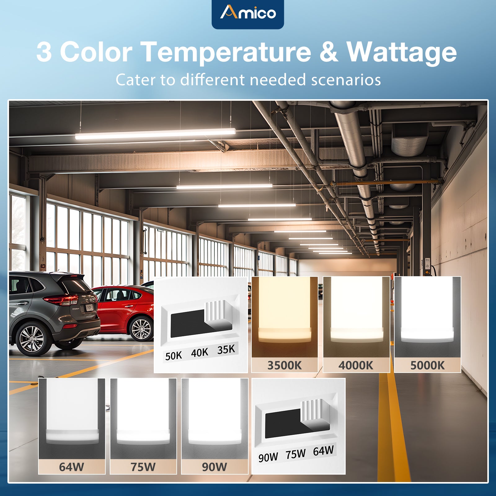 - 3CCT & 3 adjustable wattage: Our led linear strip lights feature 64W/75W/90W 3 wattage adjustable and 3500K/4000K/5000K 3 color temperatures selectable to meet different demands. And it is equipped with extra motion sensor port which helps to cater to the demand of motion sensor.