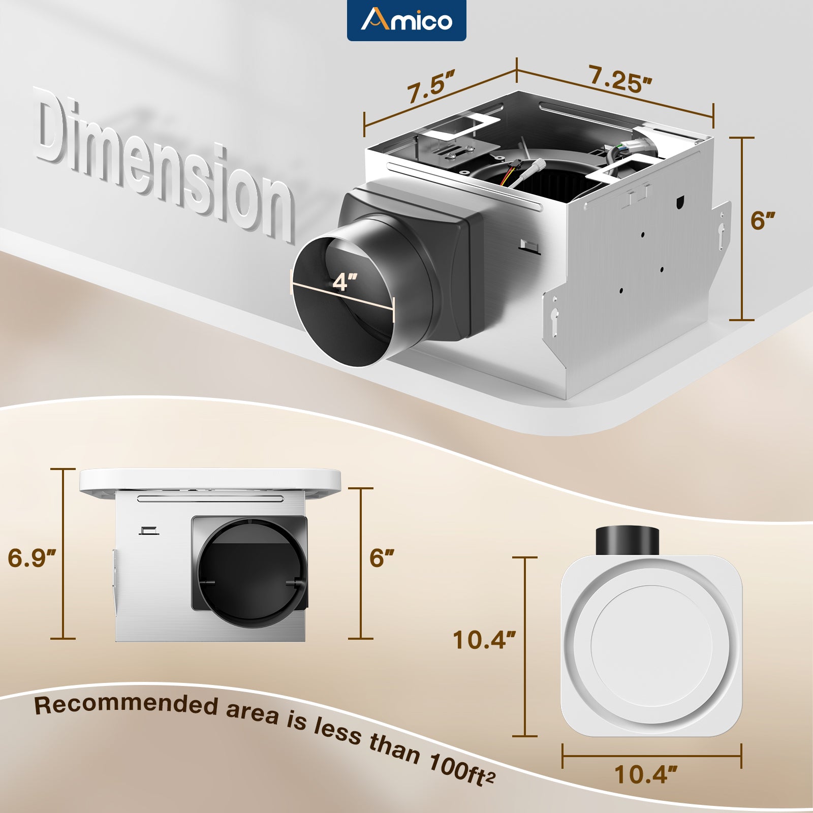 - Easy Installation: Fits 7.6 x7.3 inches ceiling construction with 4-inch duct; Includes mounting bracket for placement between joists; Housing dimensions: 7.5 x 7.25 x 6 inches; Light cover size: 10.4 x 10.4 inches.