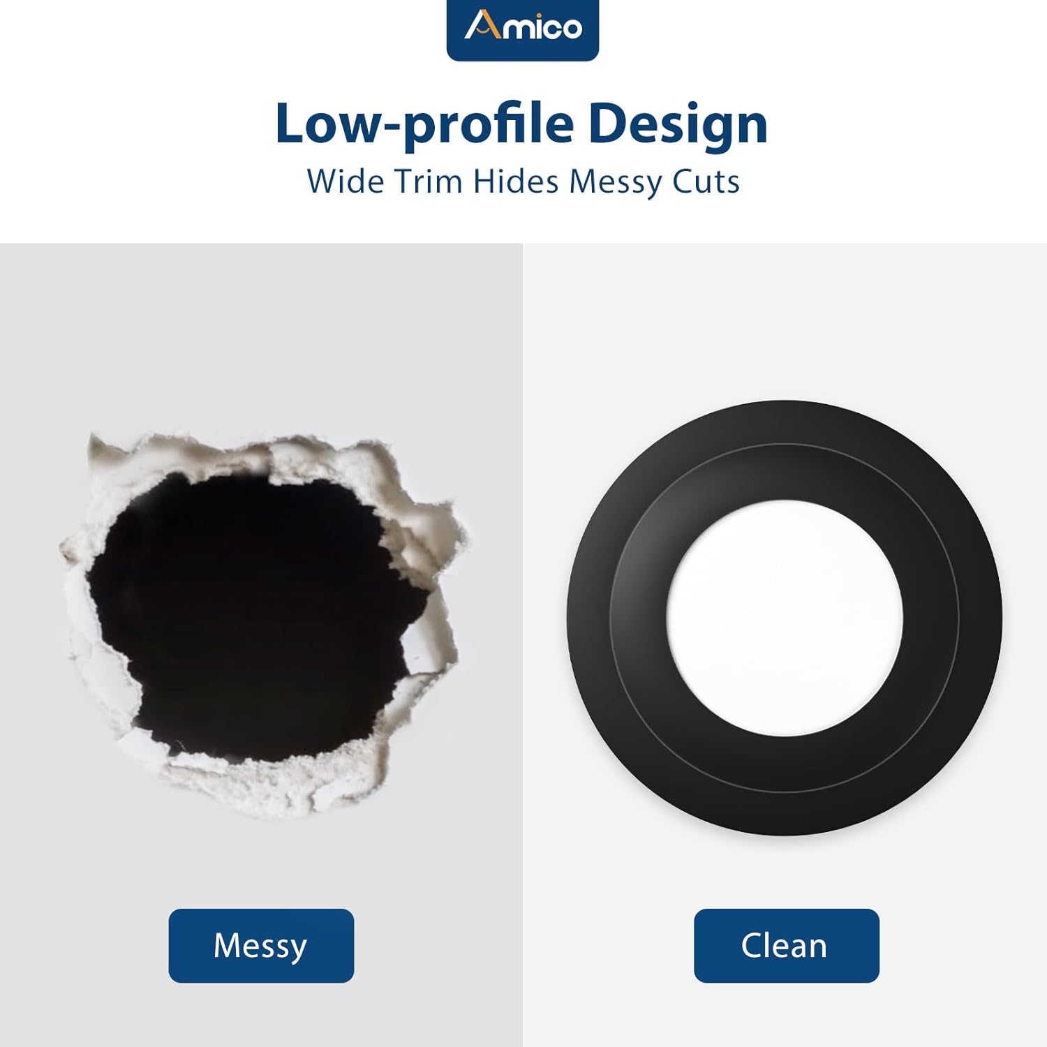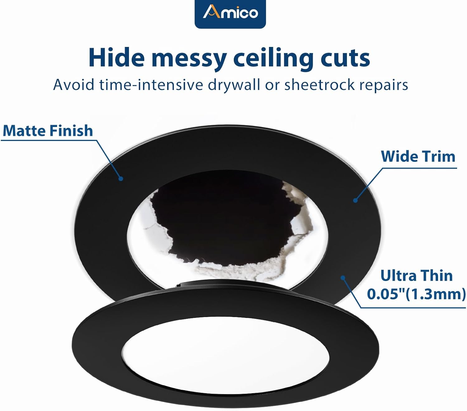 - Easy Stall - No tools are required for installation. This trim overlay sits flush against the ceiling in between the drywall and the recessed light. It easily slips onto the back of your 6 pack black recessed lights and fits between the light's trim and the ceiling drywall to hide unsightly gaps. Also works with ceiling fans and pendant lights.